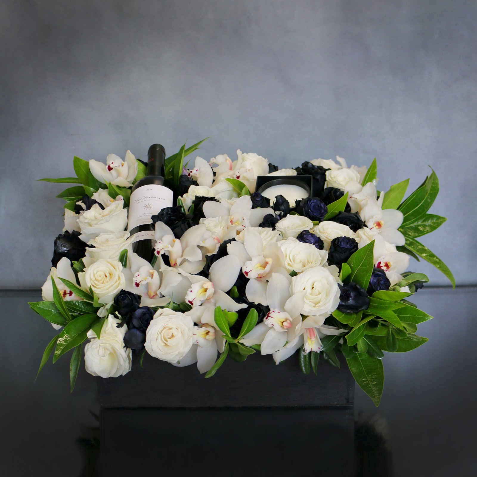 A Gift For You is a timeless and luxurious floral arrangement, showcasing the elegance of black and white roses combined with stunning white cymbidium orchids. Nestled among lush greens and arranged in a sleek black wooden box, this arrangement exudes sophistication. Accompanied by a fine bottle of wine and a candle, it’s a perfect gift for celebrations, anniversaries, or any special moment. Hand-delivered with care, this chic and stylish arrangement adds a touch of luxury to any occasion, and with same-day delivery from Beverly Hills Florist, it’s sure to impress.