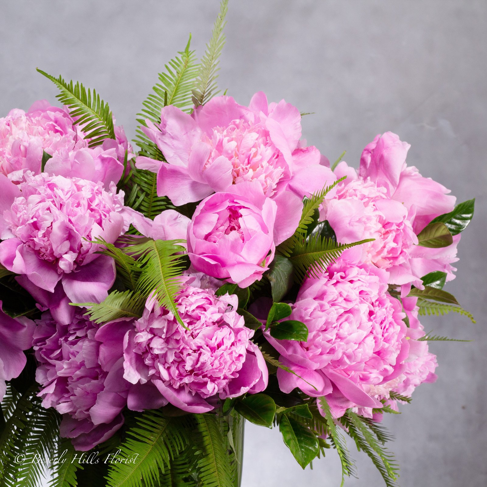 Experience the charm of “A Peony Story” with 2 dozen elegant pink peonies, artfully arranged in a tall, 12-inch round glass vase. This captivating 16-inch centerpiece is enhanced with lush umbrella ferns and Gardenia foliage, creating a chic and sophisticated display. Perfect for any occasion, this stylish composition adds beauty and elegance to any space. Available for same-day delivery from Beverly Hills Florist.