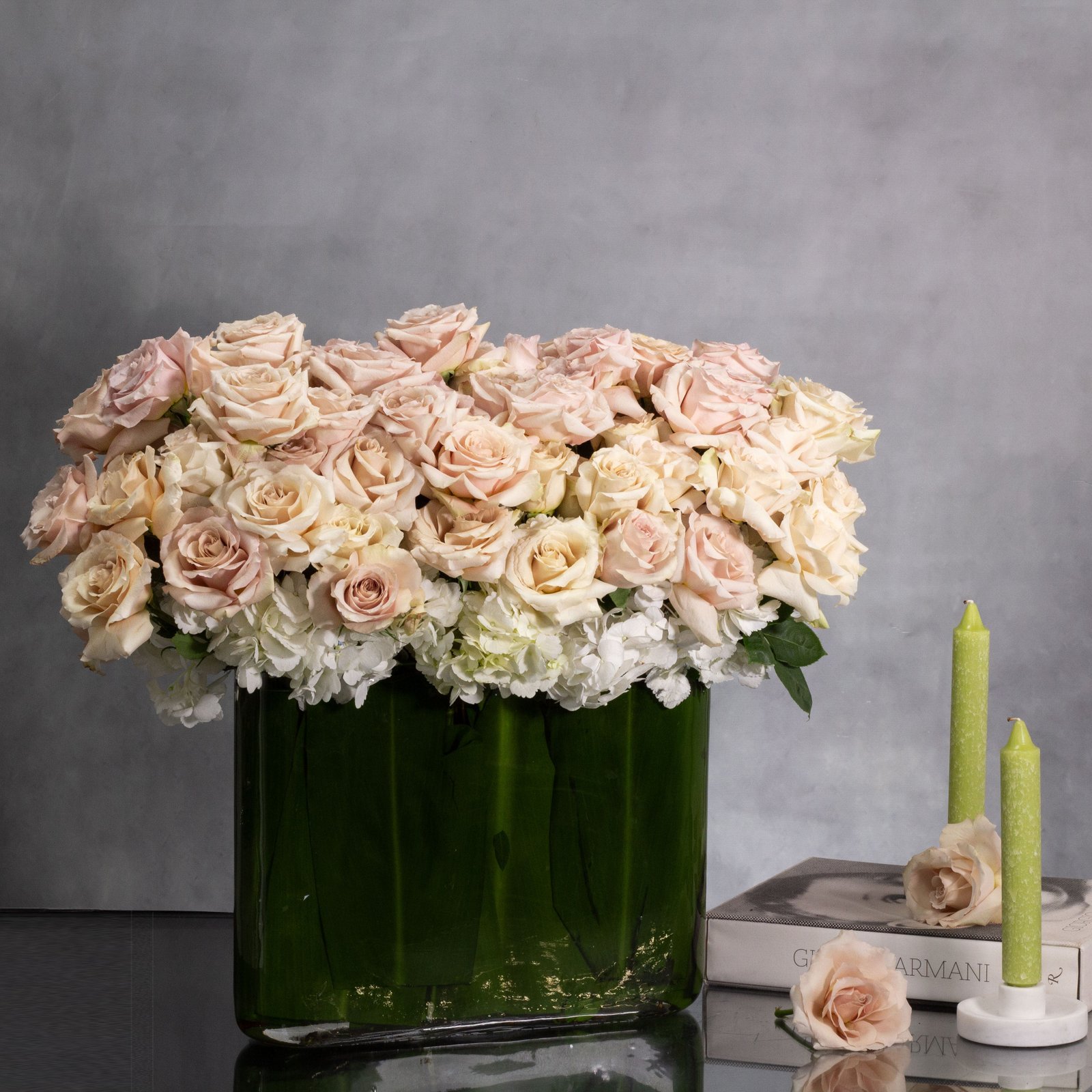 Indulge in the serene beauty of our ‘Blush Hydrangea Delight’ arrangement. Delicately arranged within a sleek, leaf-lined glass vase, soft hues of beige and light pink hydrangeas intertwine, creating an enchanting display of elegance and tranquility. Perfect for adding a touch of sophisticated charm to any space.