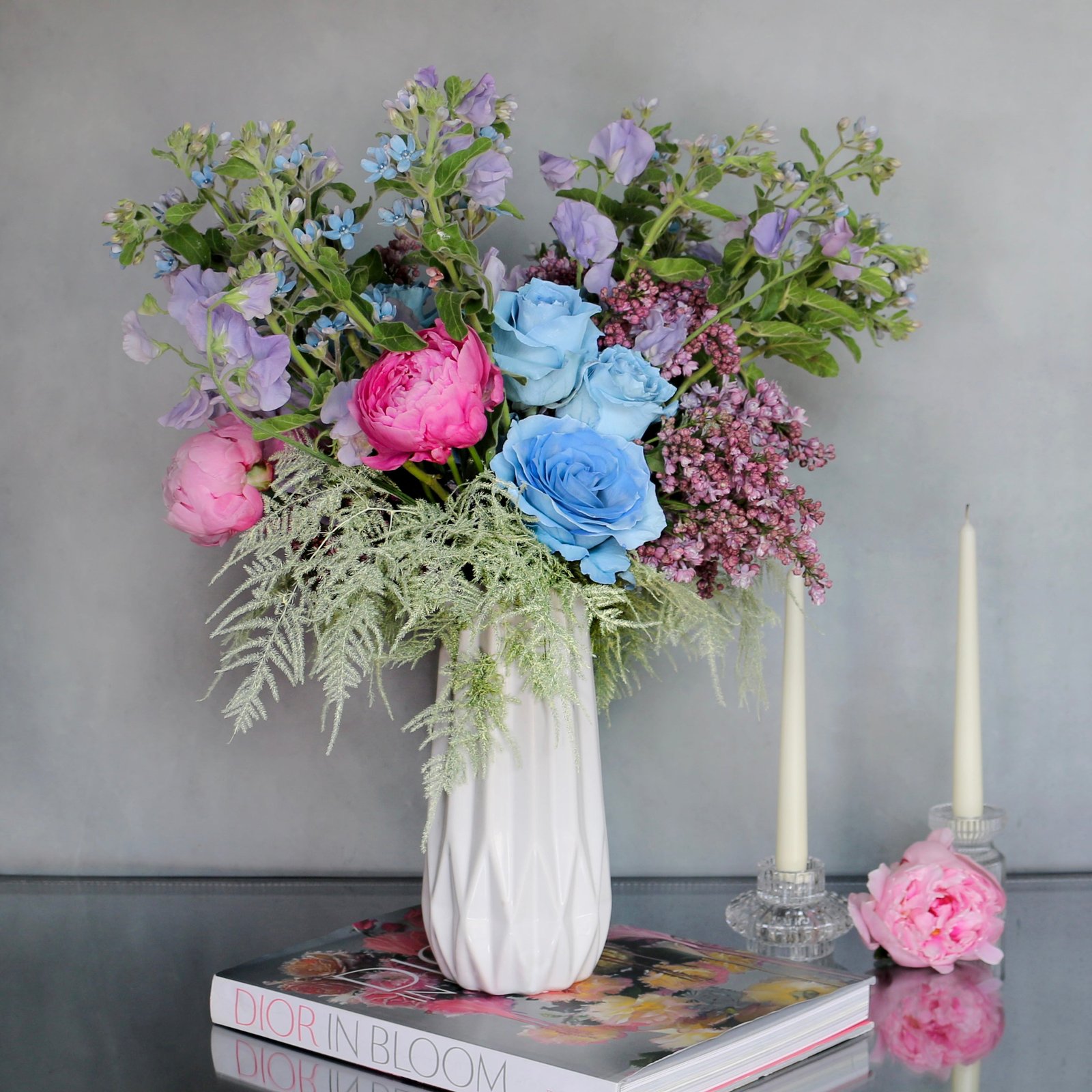 “By The Shore” consists of blue Roses, Peonies, Sweet Peas, Lilacs and seasonal florals. All arranged within a tall white ceramic vase. A soft and colorful touch to whatever room that the arrangement is placed in. A bright focus for any occasion.