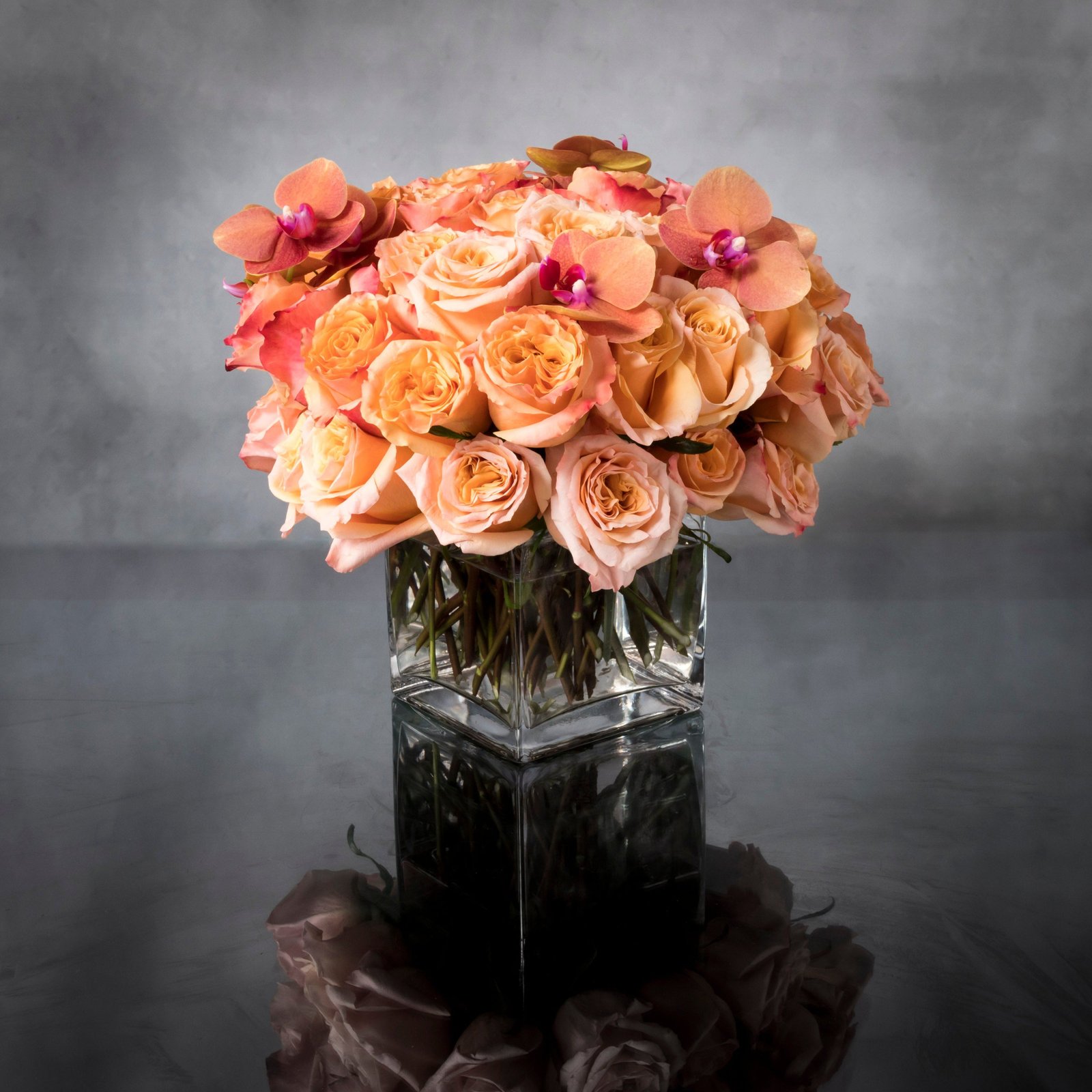 Bold and dynamic, this stunning display of Cherry Brandy roses and garden roses with orchids will drop the jaw of any onlooker. Beautifully presented in glass vase, these gorgeous roses will say what’s in your heart more eloquently than words.