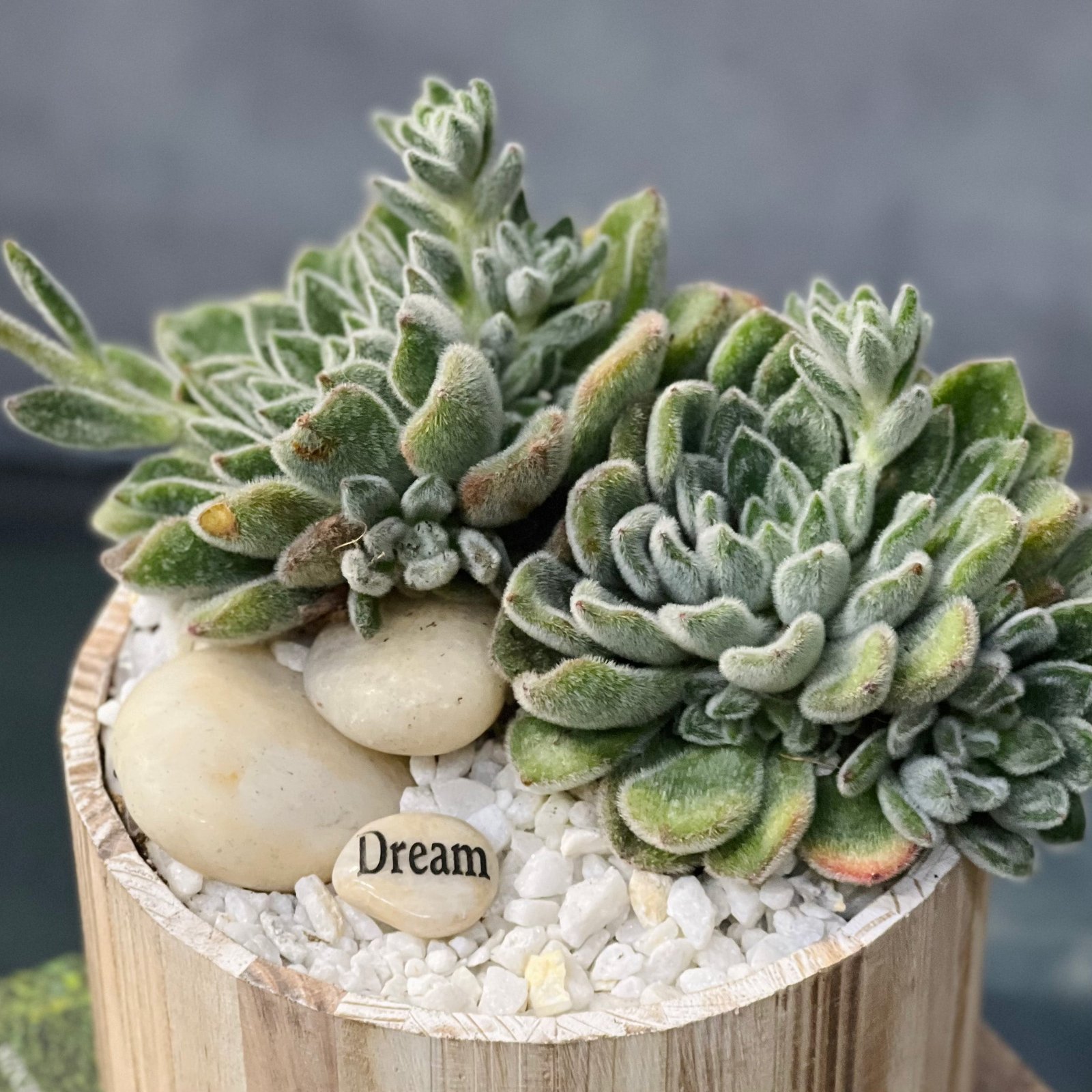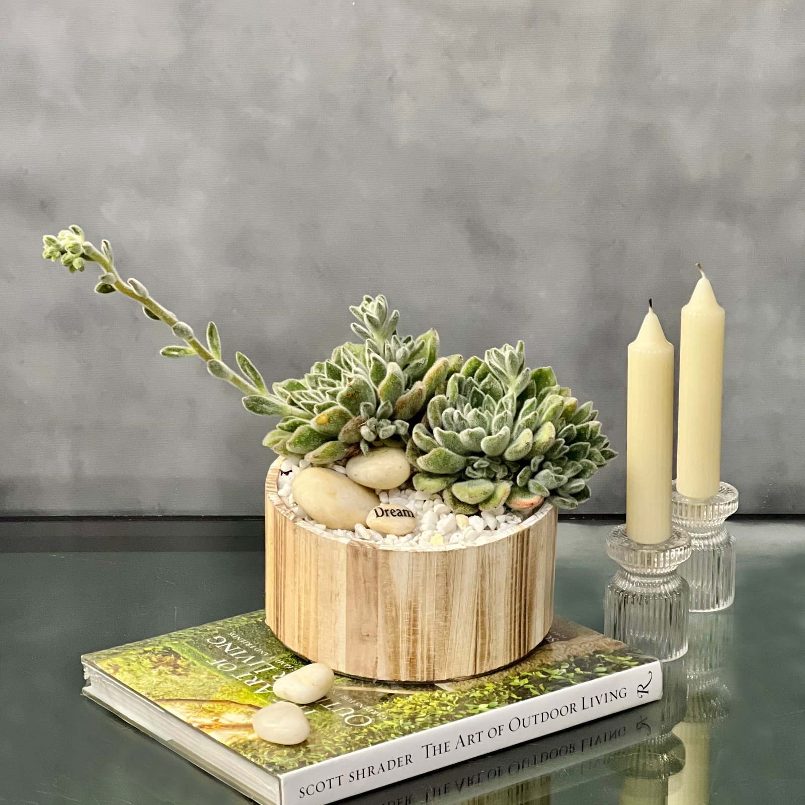 Our “Green Groovy” is ready for any space and a wonderful simplistic gift. The arrangement consists of two various succulents, a wooden box and accented with stones. A chic and modern twist to any succulent.