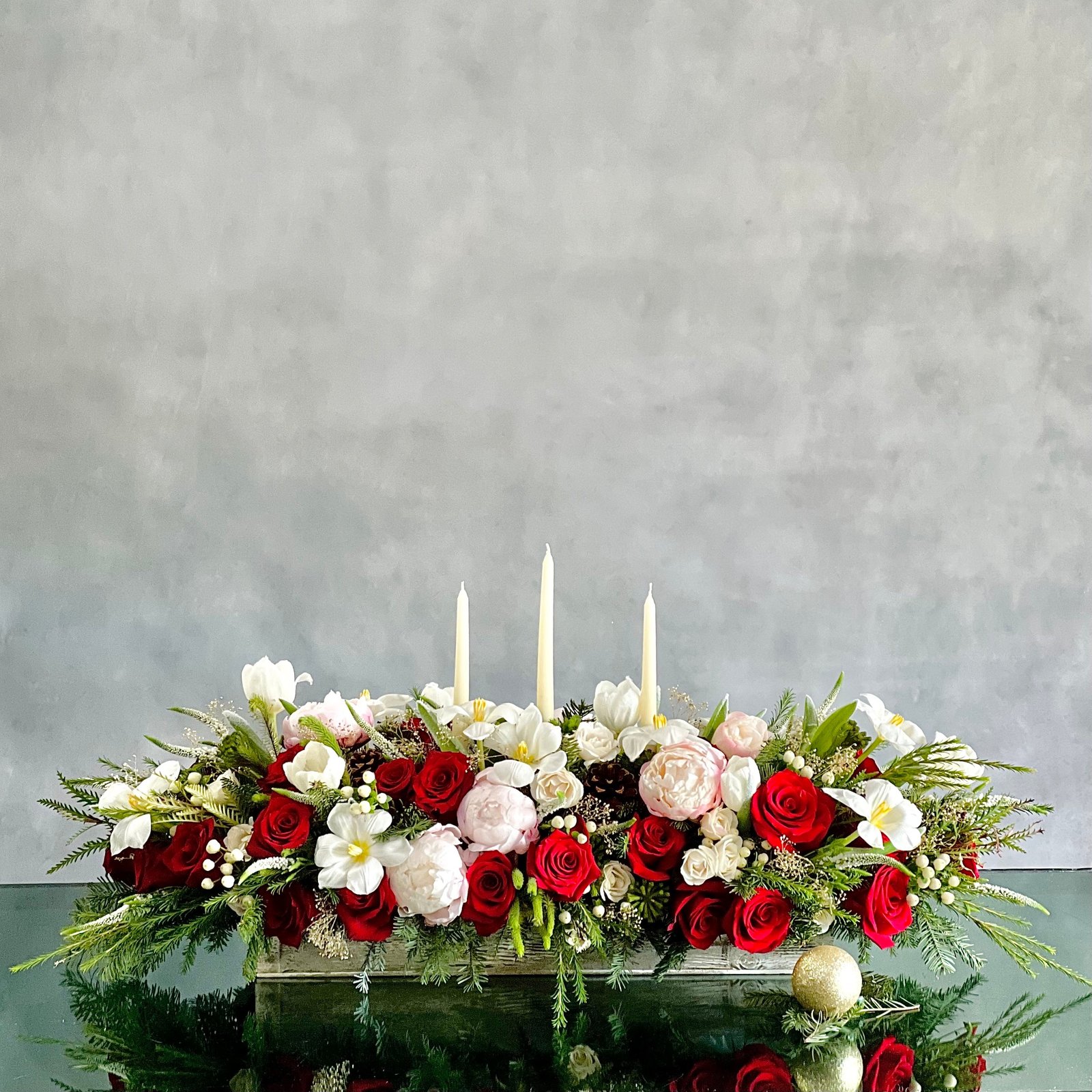 Transform your holiday gatherings into unforgettable memories with our exquisite Home for the Holidays Centerpiece. This elegant arrangement features 2 dozen vibrant red roses, delicate white tulips, festive berries, and lush peonies, creating a stunning focal point for any celebration.