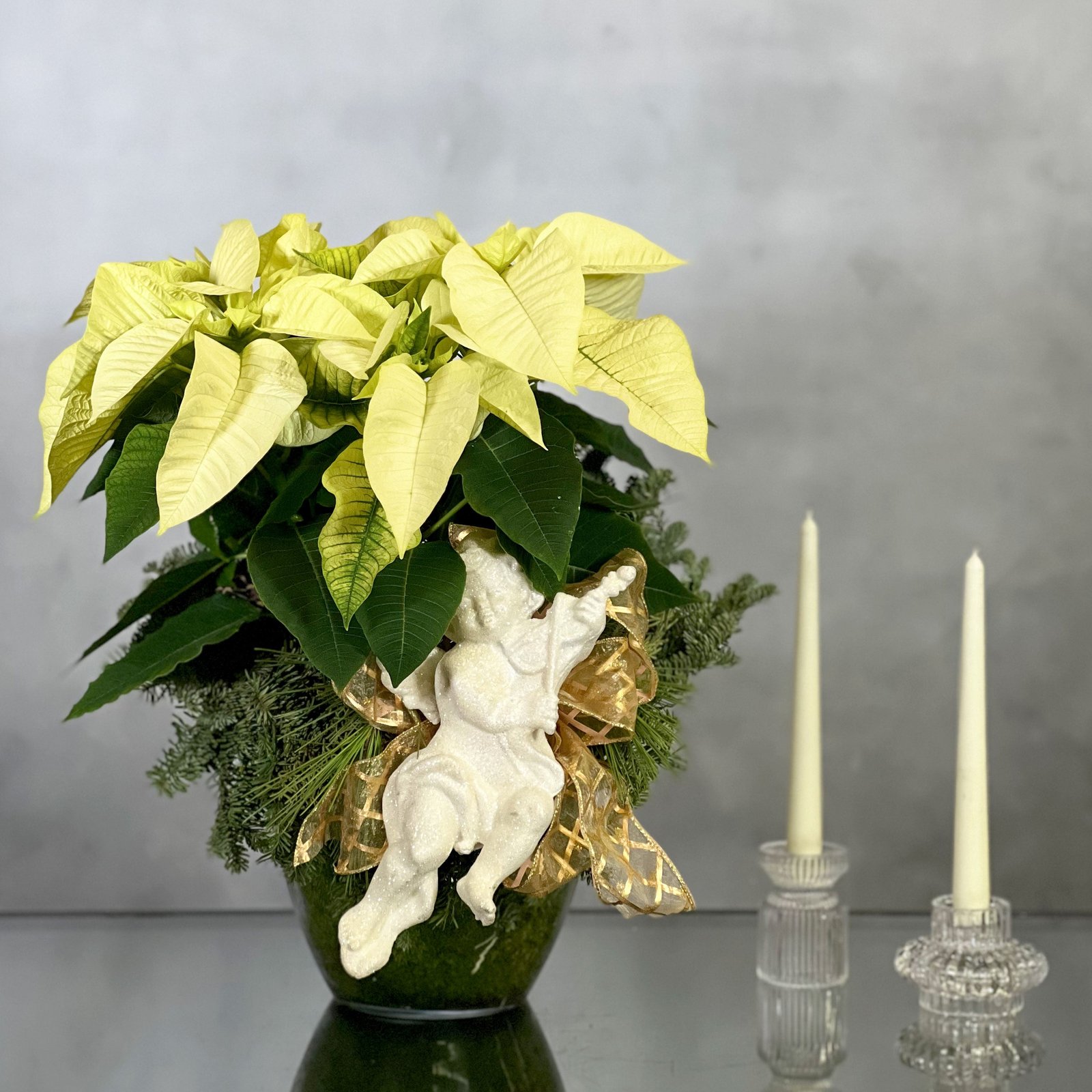 Bring holiday elegance into your home with the White Poinsettia Fantasy arrangement. At its heart, a pristine white poinsettia stands tall, its delicate leaves creating a captivating contrast against lush green foliage. Measuring approximately 20″ tall and 14″ wide, this arrangement exudes serene beauty, perfect for adding sophistication to any Christmas decor or as a thoughtful holiday gift. Available for same-day delivery by Beverly Hills Florist, it’s an ideal choice for celebrating the season with grace and charm.