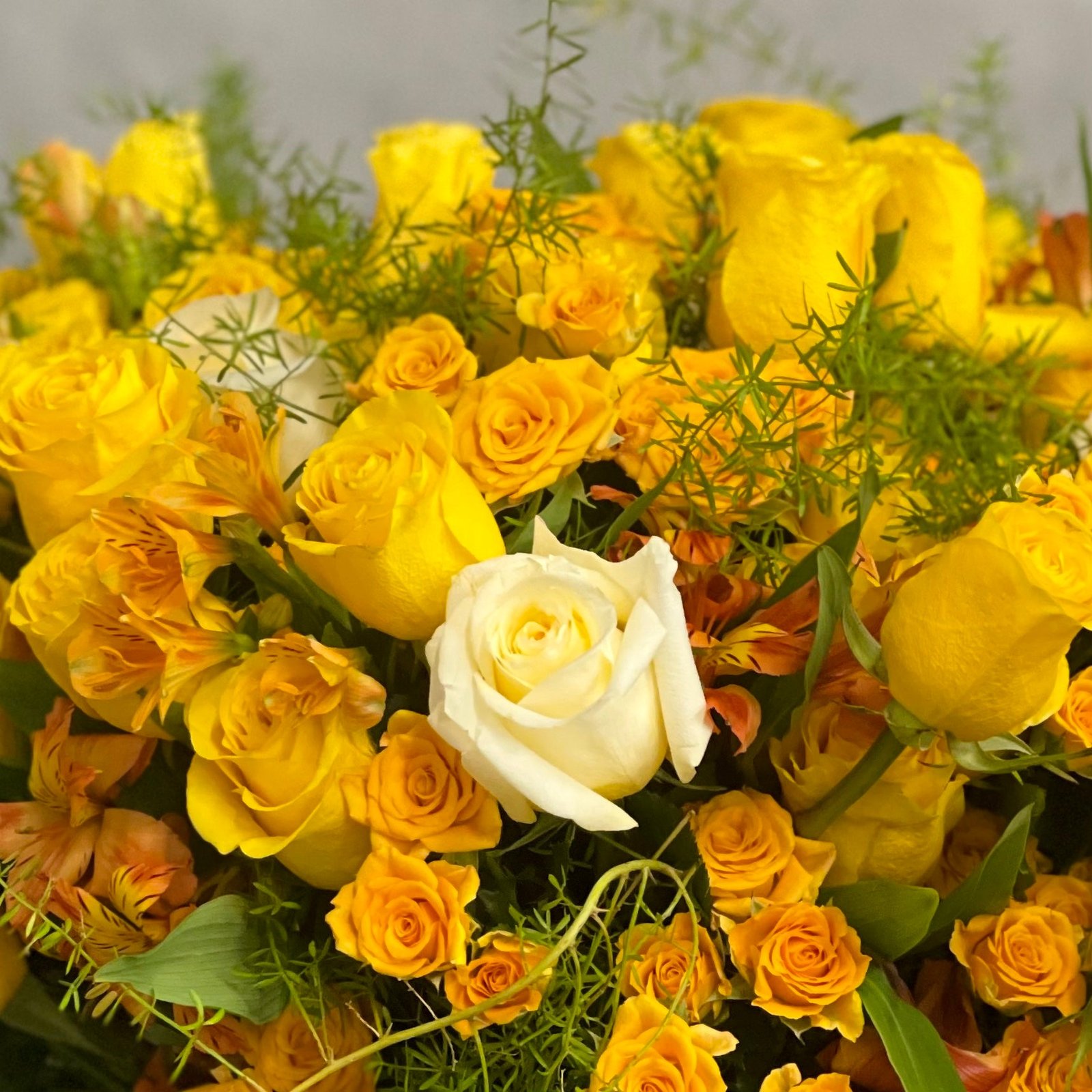 My Beverly Hills Florist presents same day delivery for this large modern beautiful yellow roses arrangement in a 10×8 cylinder glass vase. These florals bring in warmth into anyone’s heart.Â