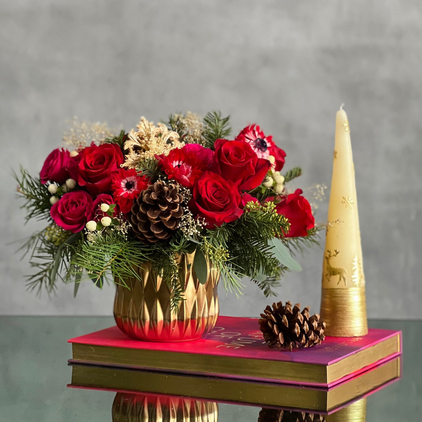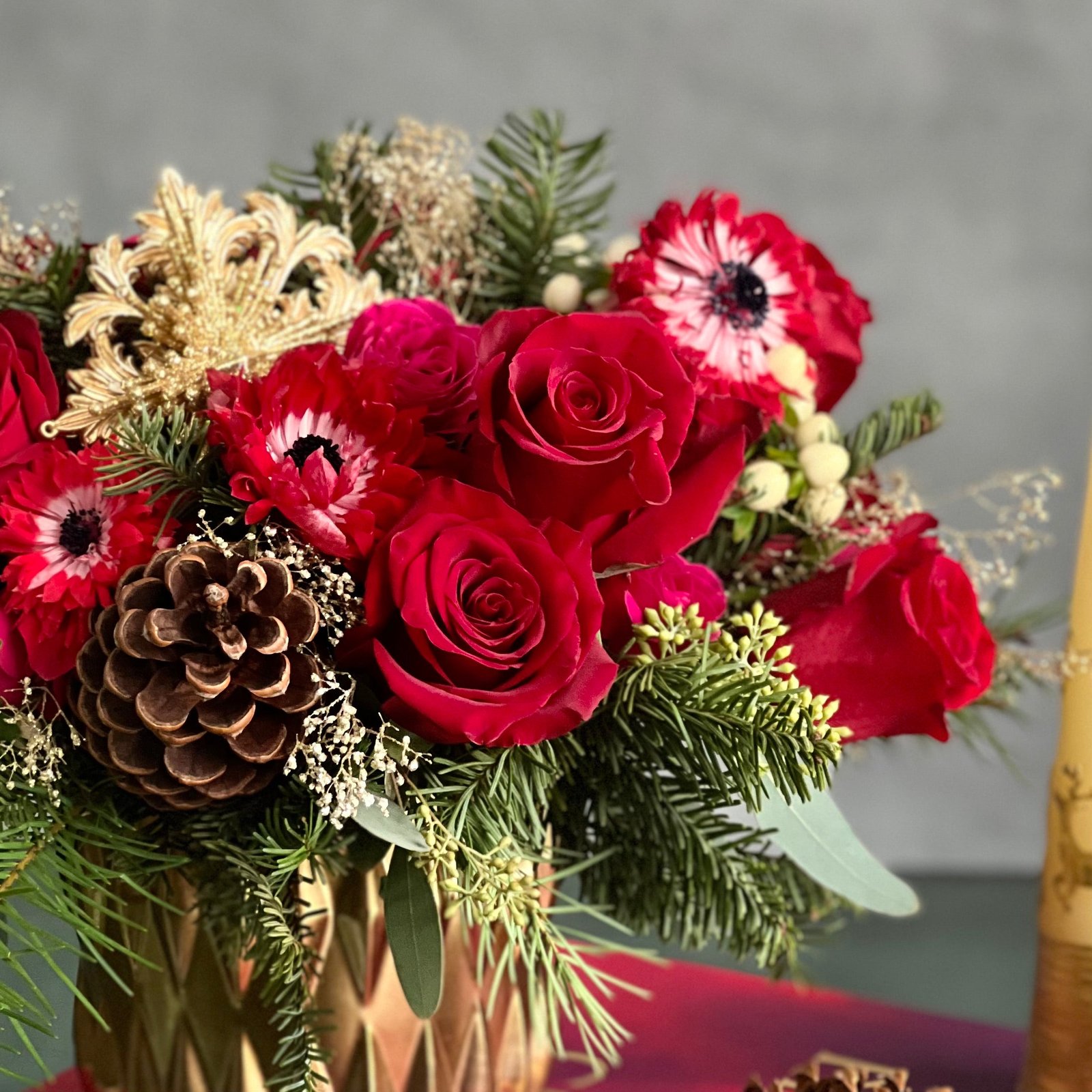 Celebrate the holiday spirit with Yuletide Spirit, featuring one dozen vibrant red South American roses and spray roses in a brushed gold cylinder vase. Accented with natural leaves, pine cones, berries, and a festive gold holiday ornament, this elegant arrangement is 11″ tall and 15″ wide. Perfect for same-day delivery in Beverly Hills, this design adds warmth and joy to any room or special occasion