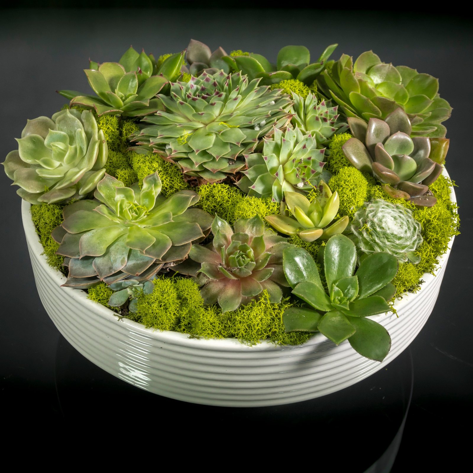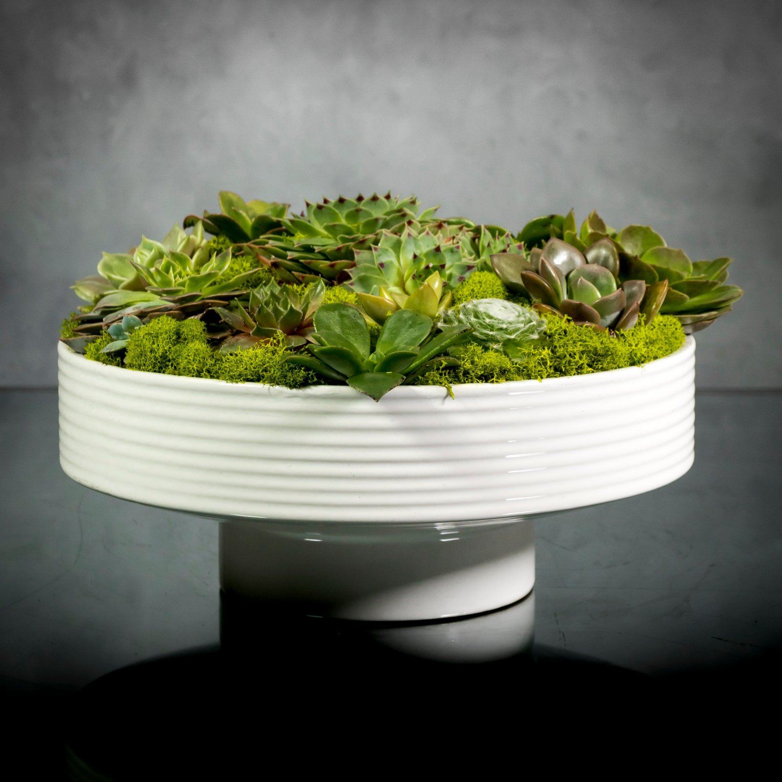 Add modern style to any space with our green succulents. These unique varieties are designed in a circular container with a gently stressed look for added charm. Easy-to-care for, it’s a great addition to the home or office.
